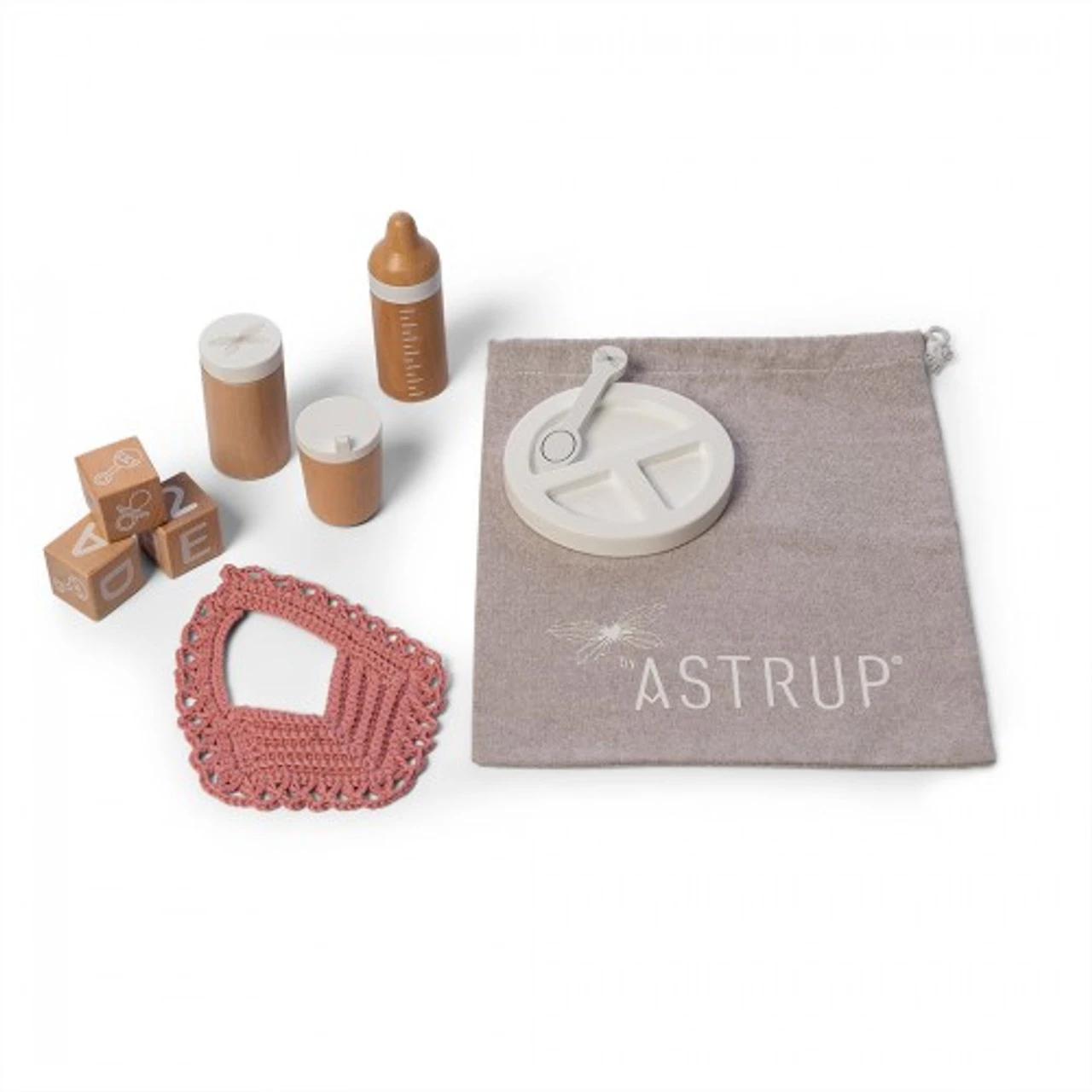 The all-essential crocheted bib, a drinking cup, feeding bottle,a storage tub with lid, a plate with a little spoon and 3 wooden blocks with numbers/letters/pictures to entertain them. Plus a handy storage bag.