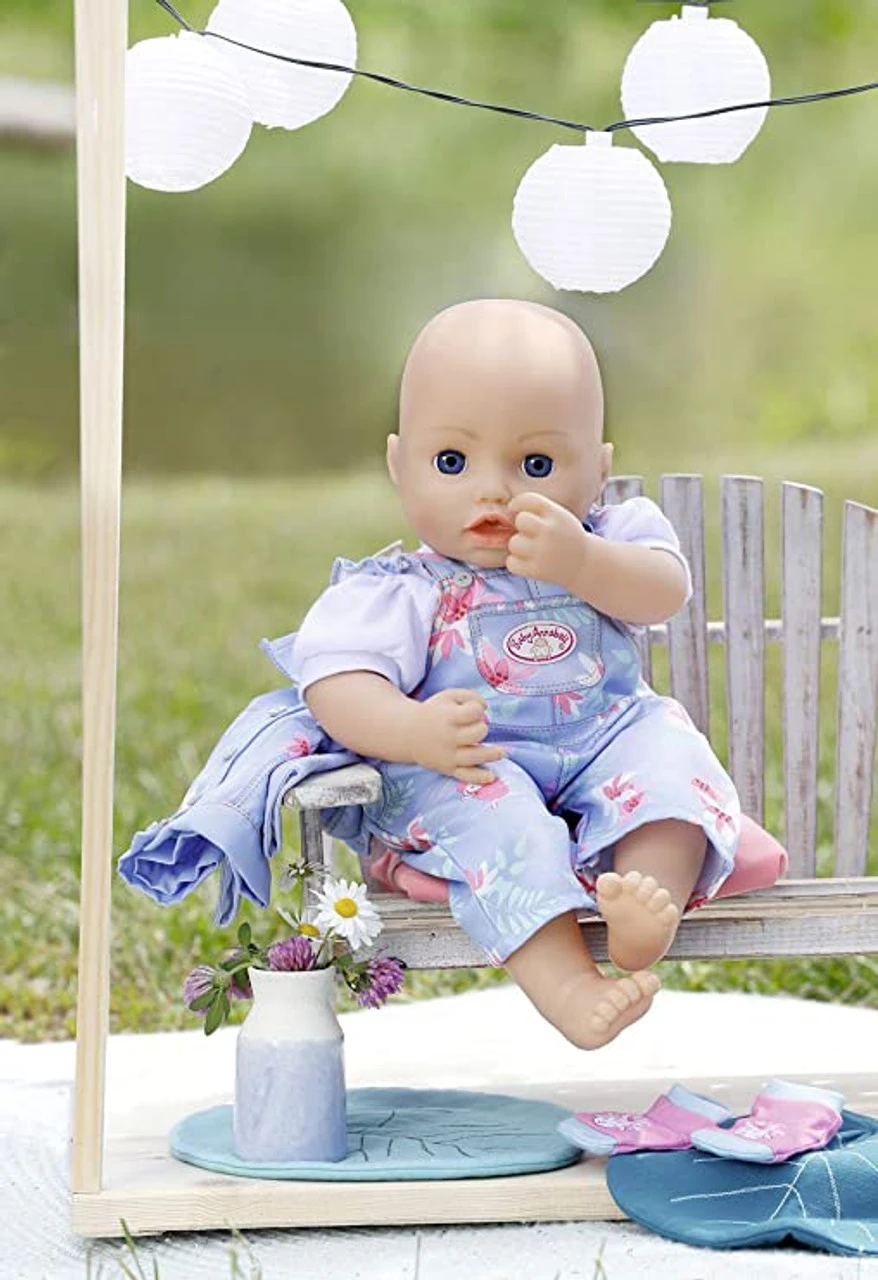 BABY ANNABELL JEANS SET – An outfit that is cool, trendy, and comfortable! This set comes with floral dungarees for lots of play, a matching jacket, a white t-shirt with golden waterlily leaves, and cuddly pink socks for when it gets a little colder
