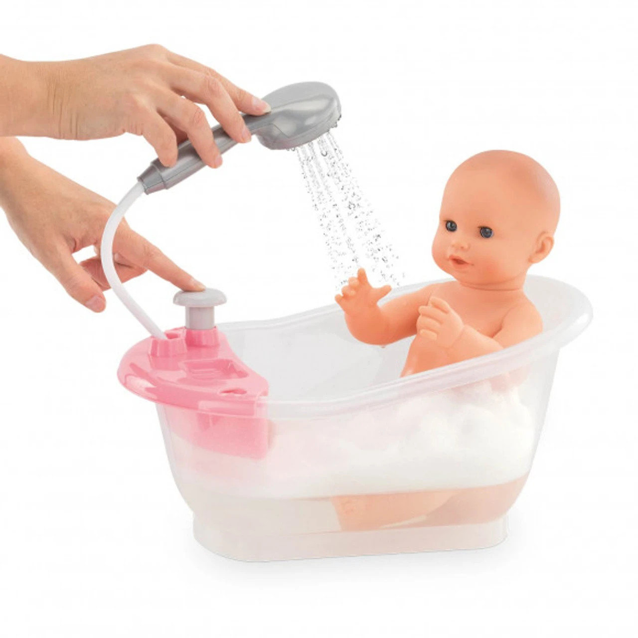 The Bathtub and Shower is the essential bathtime accessory for all dolls that can go in the water. It has a removable top with a button-activated shower head. When the tub is filled with water, push down on the button and use the shower attachment to bathe and rinse off a favorite doll. The bathtub and shower requires no batteries and is part of the Mon Grand Poupon Corolle Collection of dolls, fashions and accessories to help little ones take care of their baby doll the way their parents take care of them.