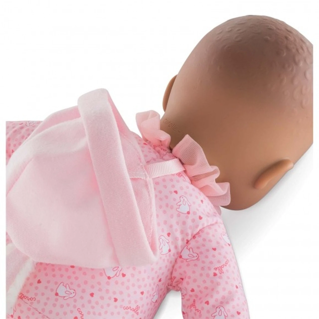 This little 30cm baby doll is just the right size for a child’s little arms and hands to hold and move easily. Its soft, bead-free body is light and easy to grasp. The doll’s head and hands are made of delicately vanilla-scented, soft-touch vinyl. The soft “pajamas and slippers” effect body is made of several different fabrics to stimulate baby’s senses. It is not removable.