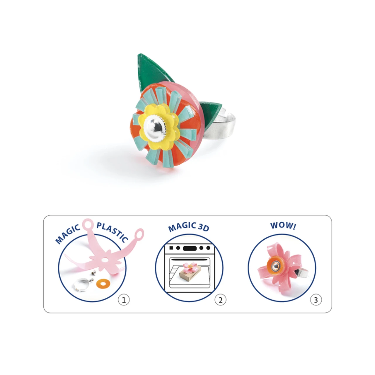 Experiment with volume by creating 3D sculptures from pre-tinted magic plastic sheets. Use the guide to help create a ring collection and oven bake to set in place.