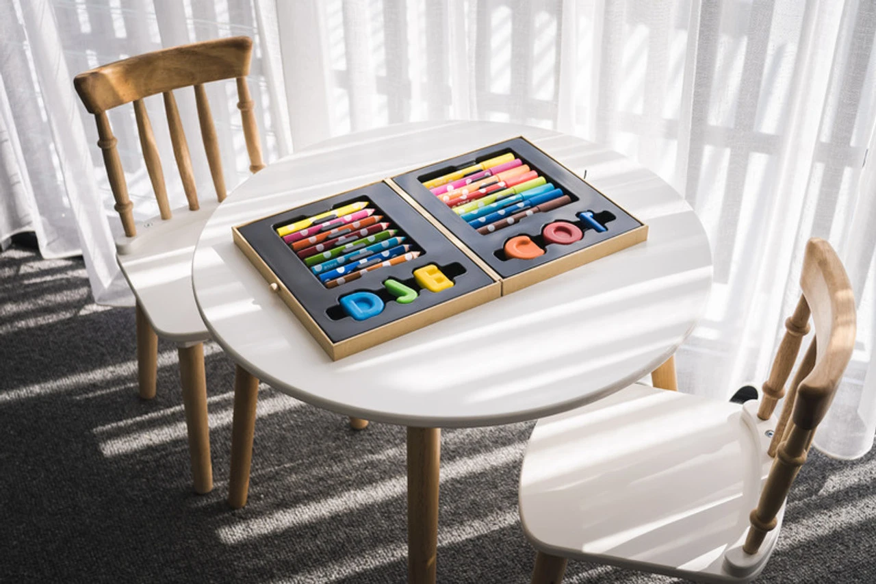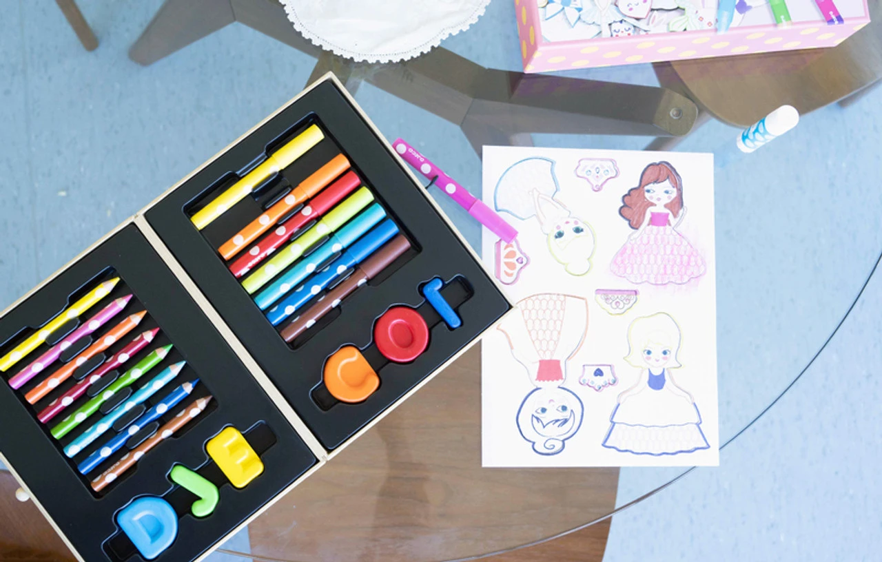 This little box is filled with all the art supplies a little one could need. Inside you will find a set of markers, pencils and crayons. All designed for little hands to hold.