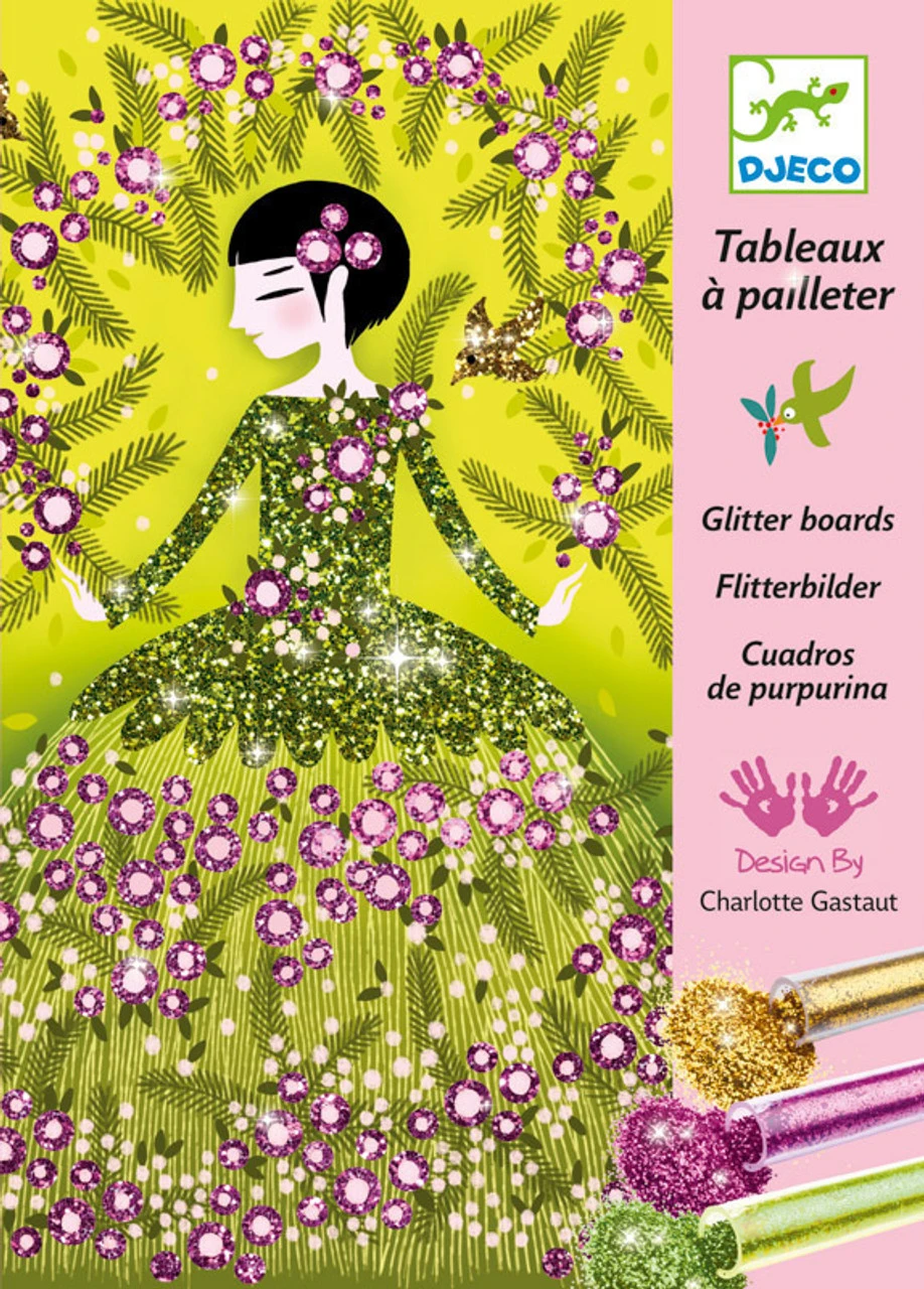 Contents: four sticky-faced boards, six tubes with coloured sequins, 1 gadget, a brush and step-by-step instructions.