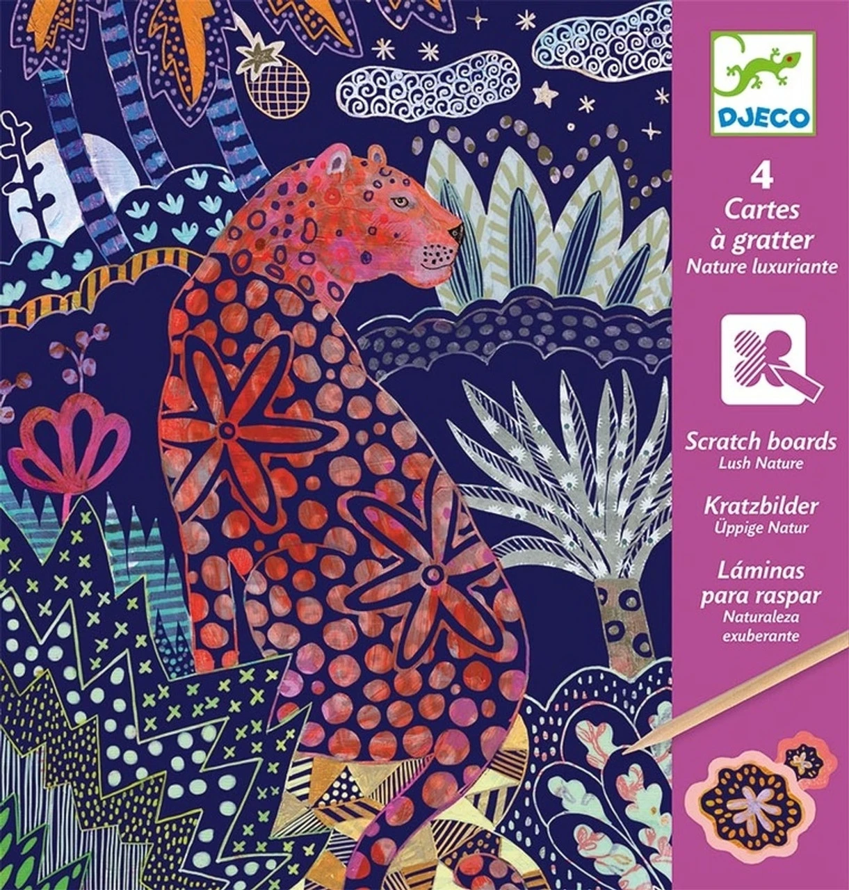 Lush jungle scenes with exotic animals come to life with beautiful patterns as the design is scratched away. Scratch the cards with the provided tool to reveal the surprise pictures. Packs include 4 cards and the wooden scratch tool.
