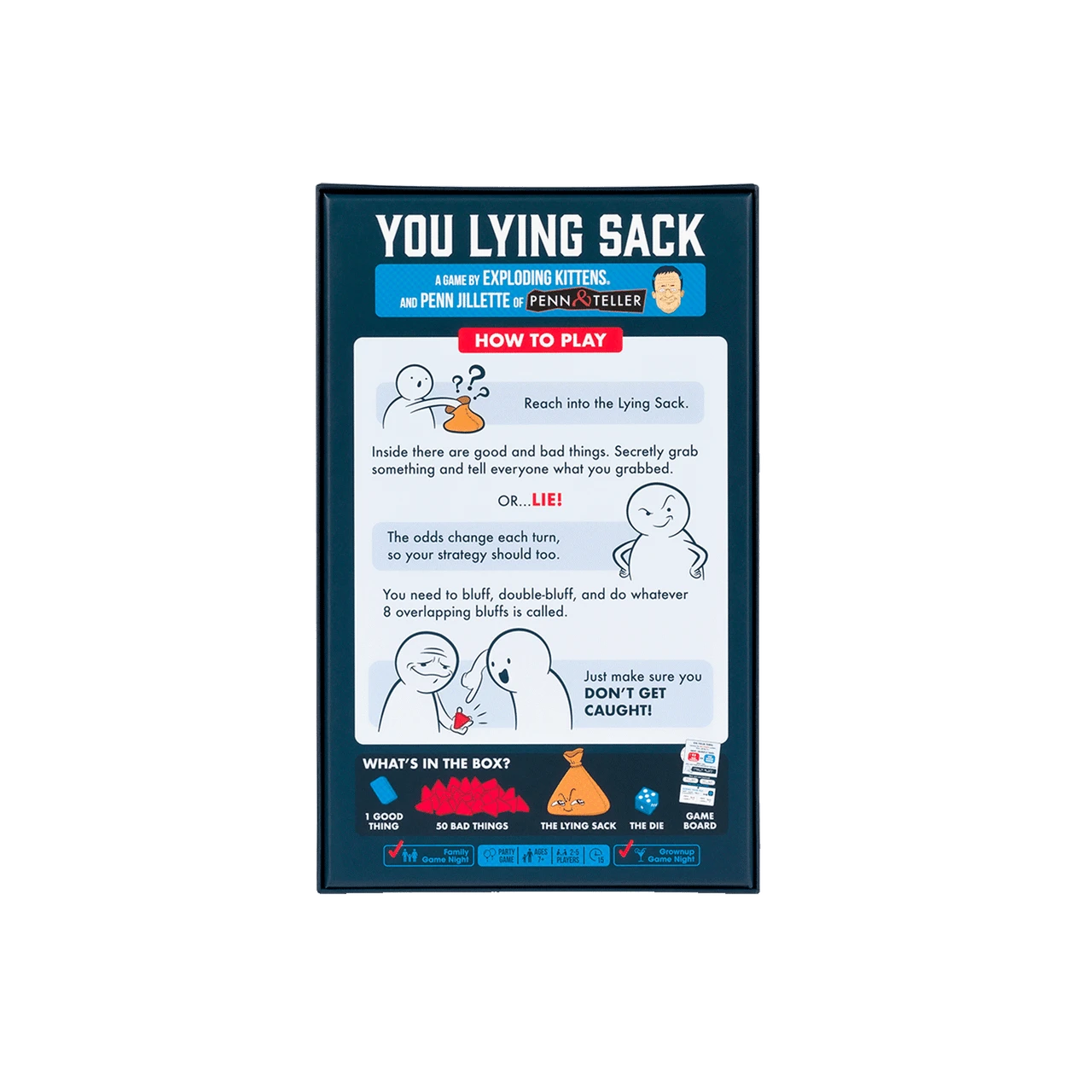 To play, reach into the Lying Sack and secretly grab Good or Bad Things, then go around the table and offer your closed fist. You will need to bluff, double-bluff, and do whatever 8 overlapping bluffs is called to outsmart your opponents. The odds change each turn, so your strategy should too. Will you outsmart your opponents? Or will you get caught?