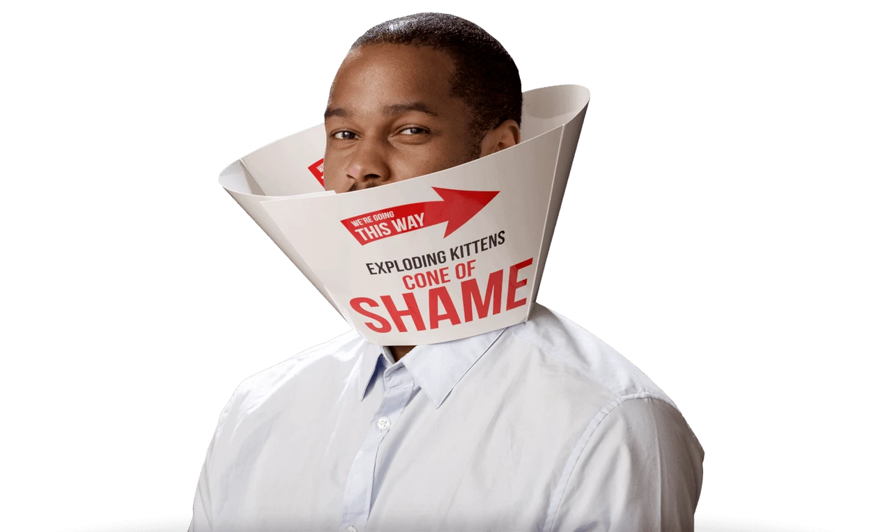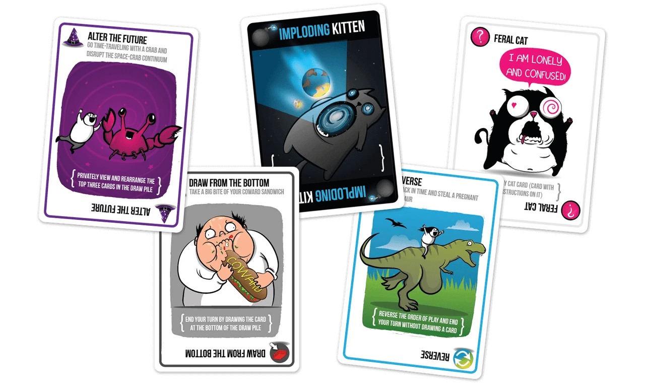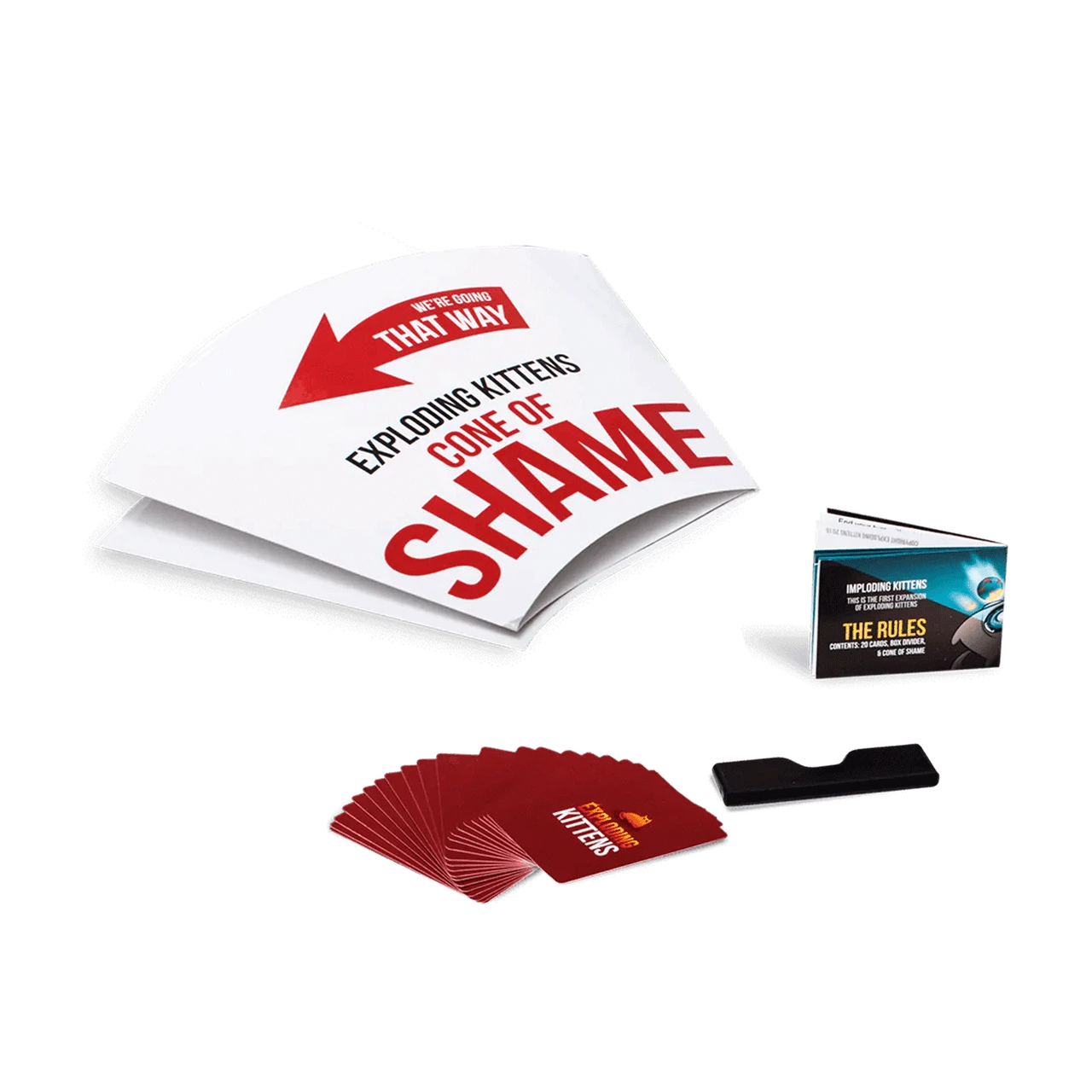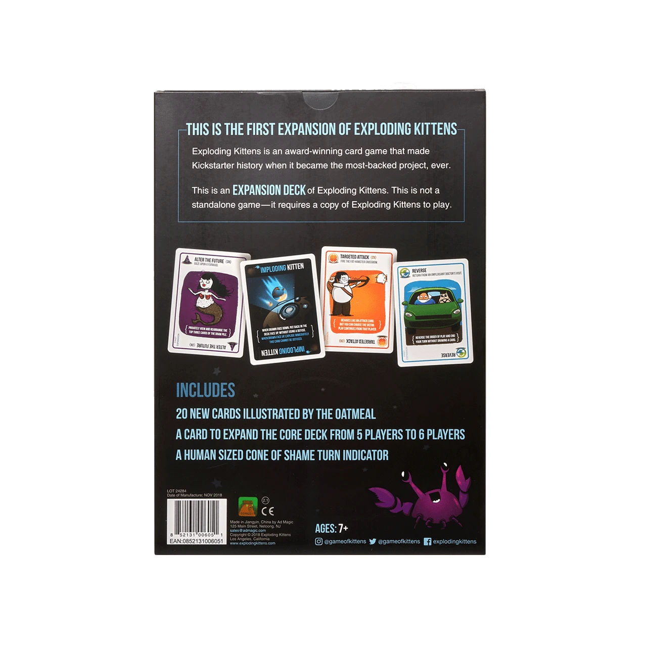 This is the first expansion of Exploding Kittens. Not only does this expansion allow you to play with up to 6 players, it also introduces 20 new cards. One of those cards is the Imploding Kitten, which is placed face up in the deck and when drawn leads to an inevitable explosion. You CANNOT defuse an Imploding Kitten. Plus, the game comes with a human-sized Cone of Shame turn indicator.