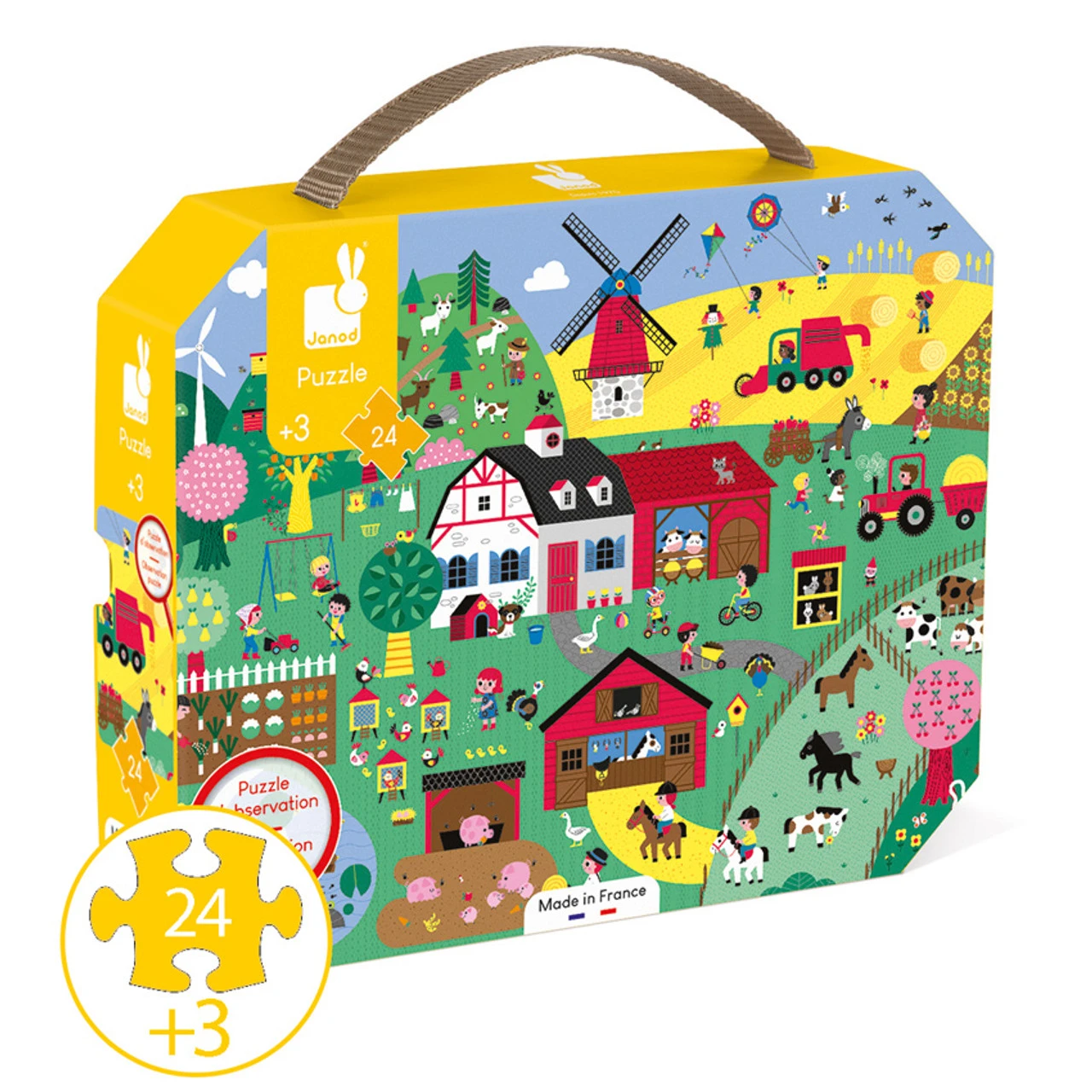 Test your skills with the 24 piece Observation Farm Puzzle from Janod that is presented in the classic Janod suitcase with carry handle. Build the FSC certified cardboard jigsaw using the included poster for help and once you have finished, hunt for all of the individual images you can see at the bottom. Made in France and printed using vegetable based inks, can you locate the turkey, saddle or flower? See how fast you can find everything and then challenge your friends!