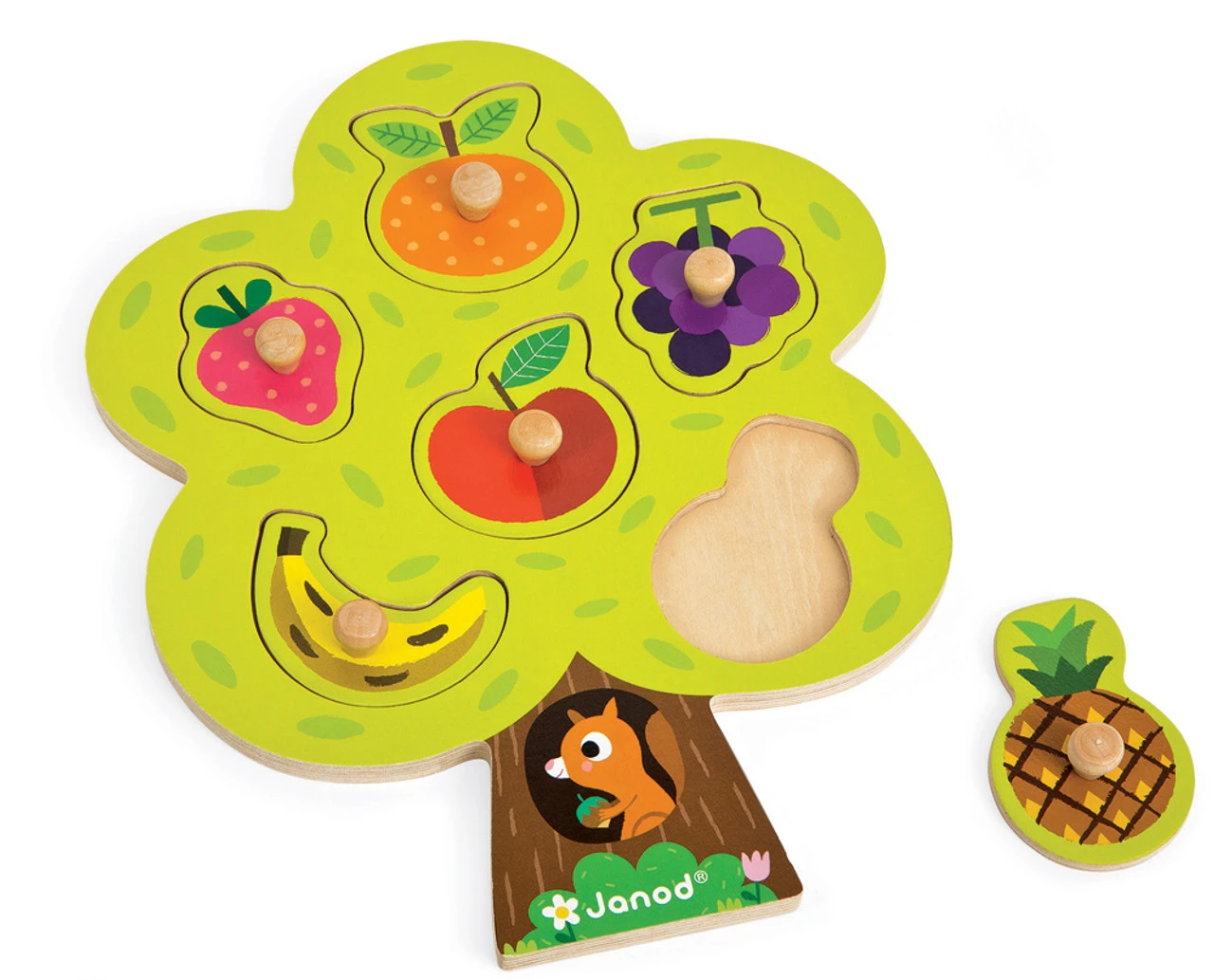 Help squirrel find his food. Place the six pieces of fruit in the tree for squirrel to discover. Little hands will develop fine motor skills by learning to manipulate each piece into its place. Each puzzle piece features a little peg to help with hand eye coordination.