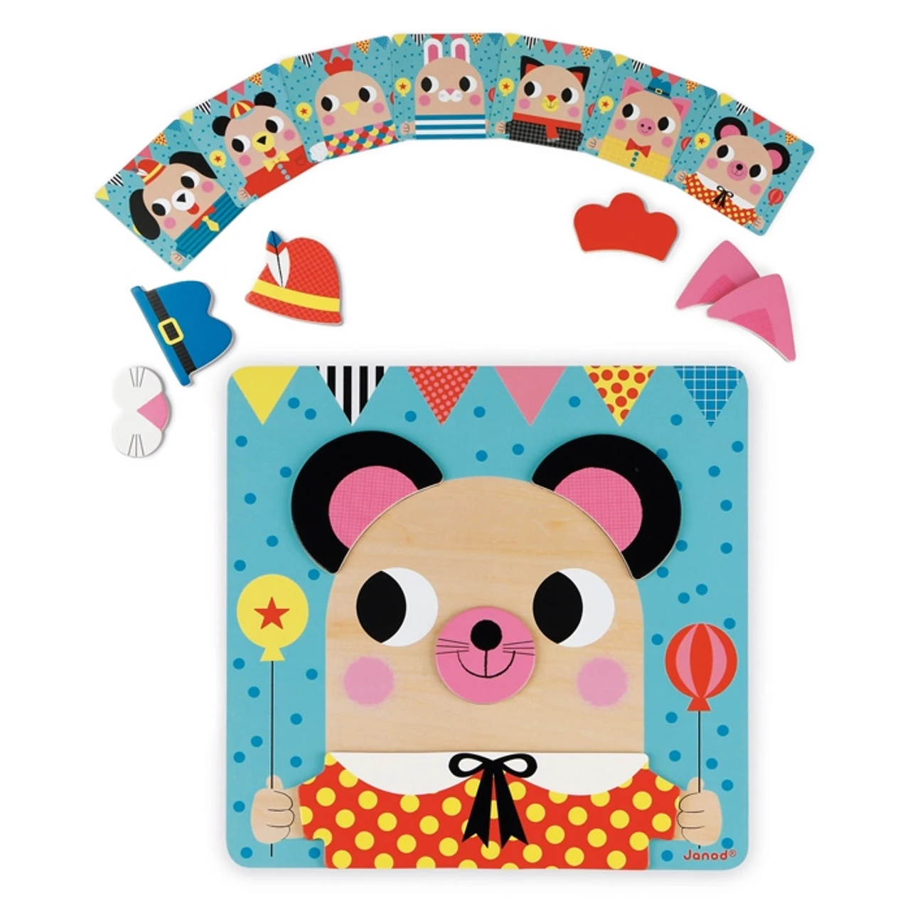 30 giant magnetic pieces and hundreds of combinations possible! This magnetic association game is ideal for developing fine motor skills. It will also aid in shapes recognition to compose the dog, rabbit, cat, bear, mouse, hen and pig. The pack includes 1 wooden board for placing the shapes, 30 magnetic pieces and 7 animal cards to copy. First use the cards and then use your imagination to make up your own interesting animal!