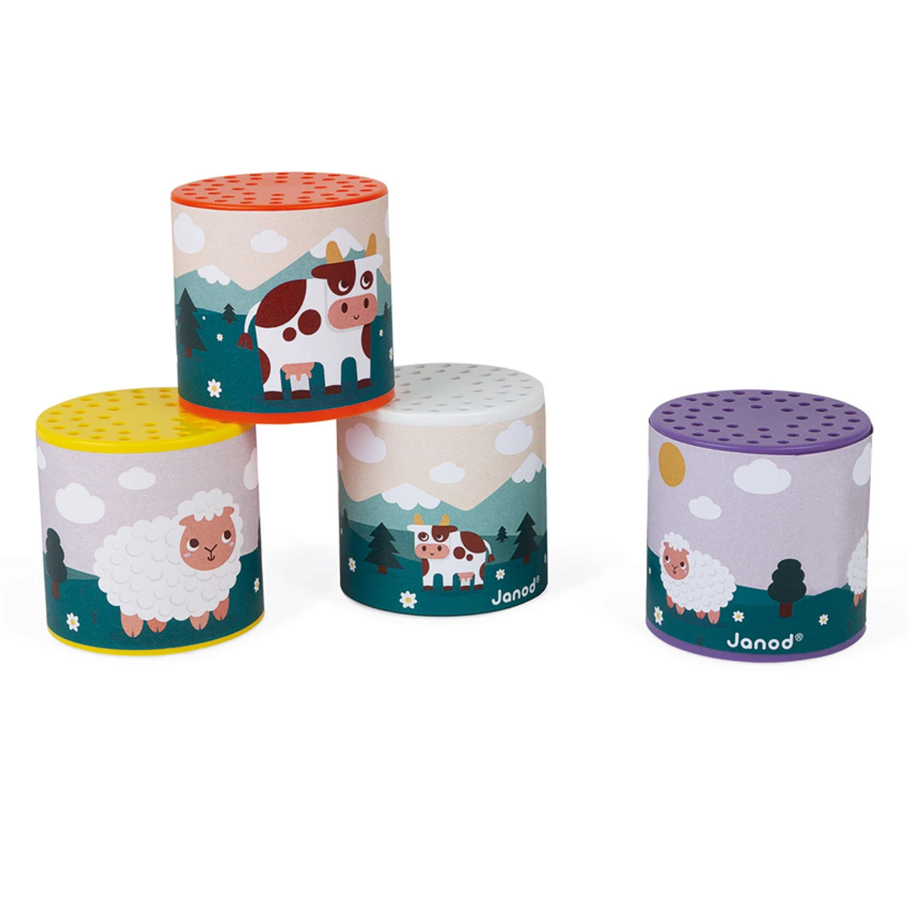 Noisemakers are a favourite with the littlies and they encourage expression and sensory perception. Sold in a POS pack of 12 and made in Germany, the Janod Moo and Baa Pocket Noisemakers are brightly coloured and are adorned with sweet cow and sheep images to match the noise each one makes. Flip them upside down and then slowly stand them right way up to hear the easily recognised farm animals. You will be hard pressed to choose just one!