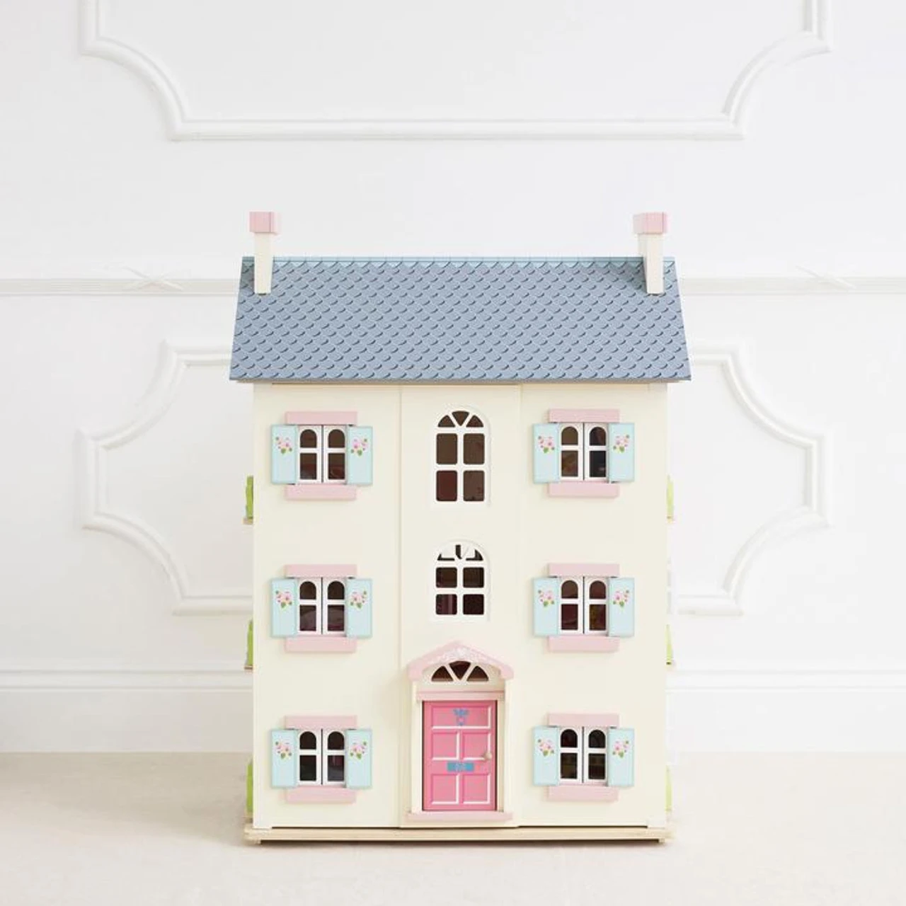 Role play fun adventures await with this simply stunning toy dollhouse, fitting for any miniature lord or lady. Full of exquisite details, this grandiose home is fully painted in soft creams with pink and blue accents and sweet flower motif detailing.
