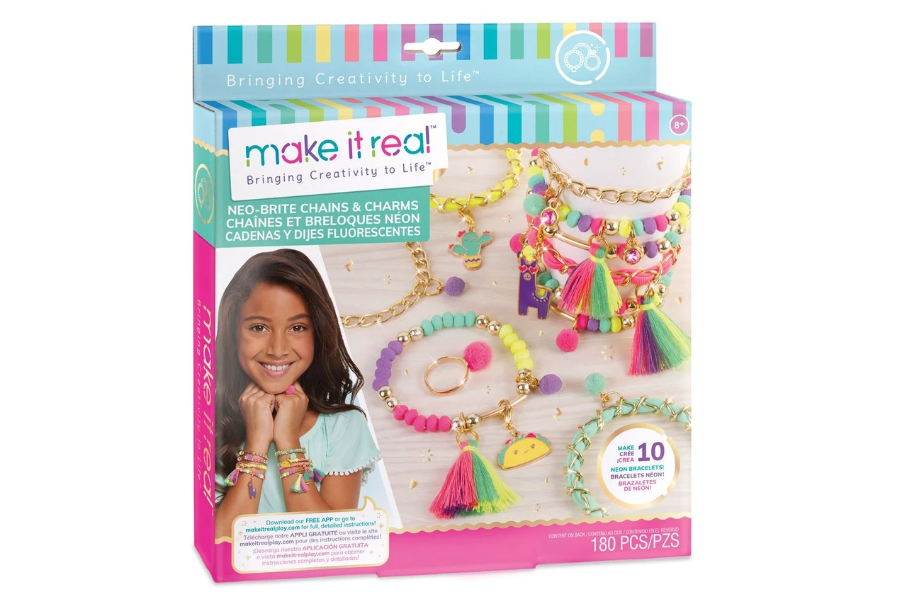 Creating 10 eye-catching neon bracelets and a textural pom-pom ring is simple with this set’s easy-to-follow instructions and full suite of materials.