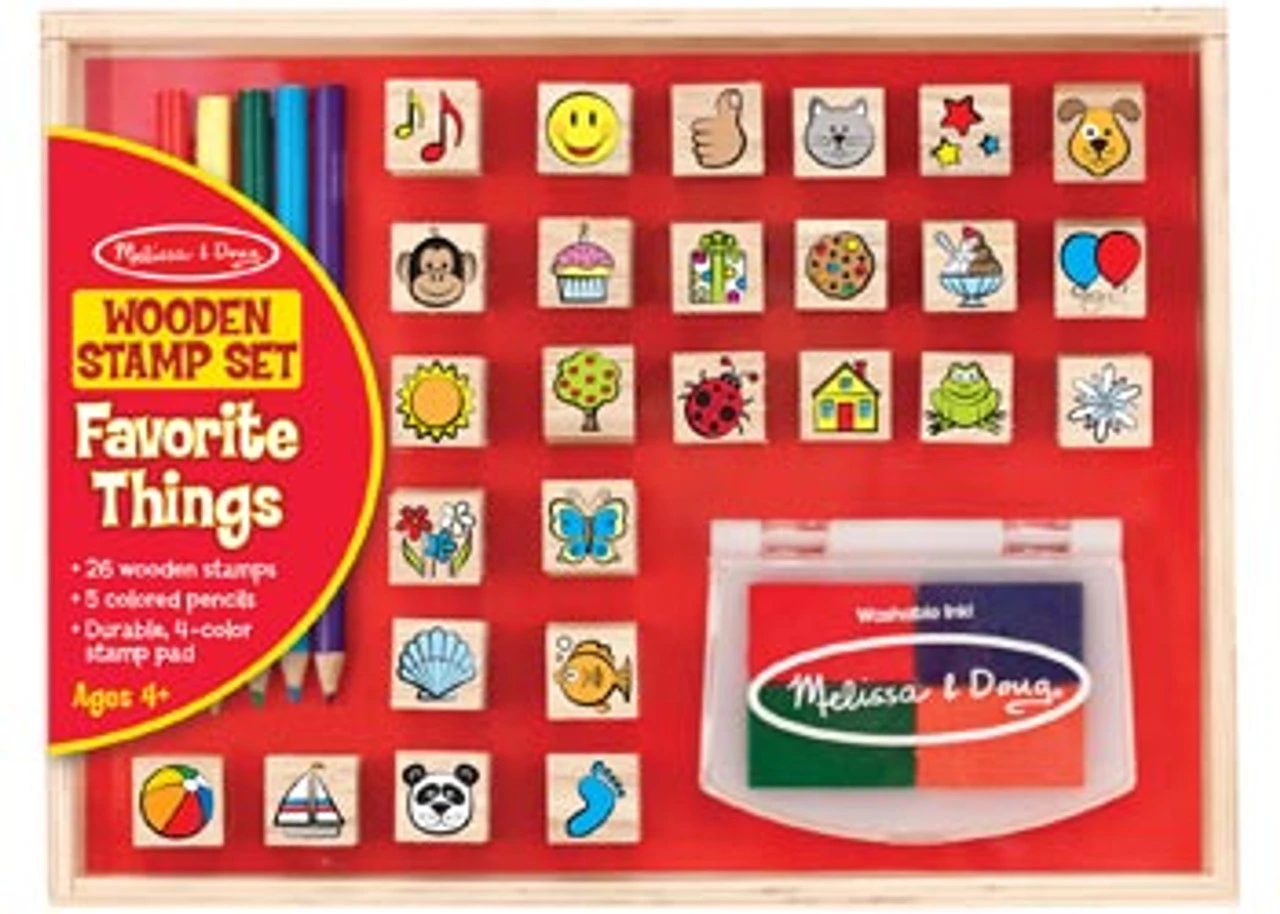 This set of 26 wooden stamps features all sorts of favourite things, from pets and wild animals to sweets and party treats! Also included are five colored pencils, a four-color stamp pad with washable ink, and a sturdy wooden box for storage. Great for making cards, scenes, and exciting storylines!