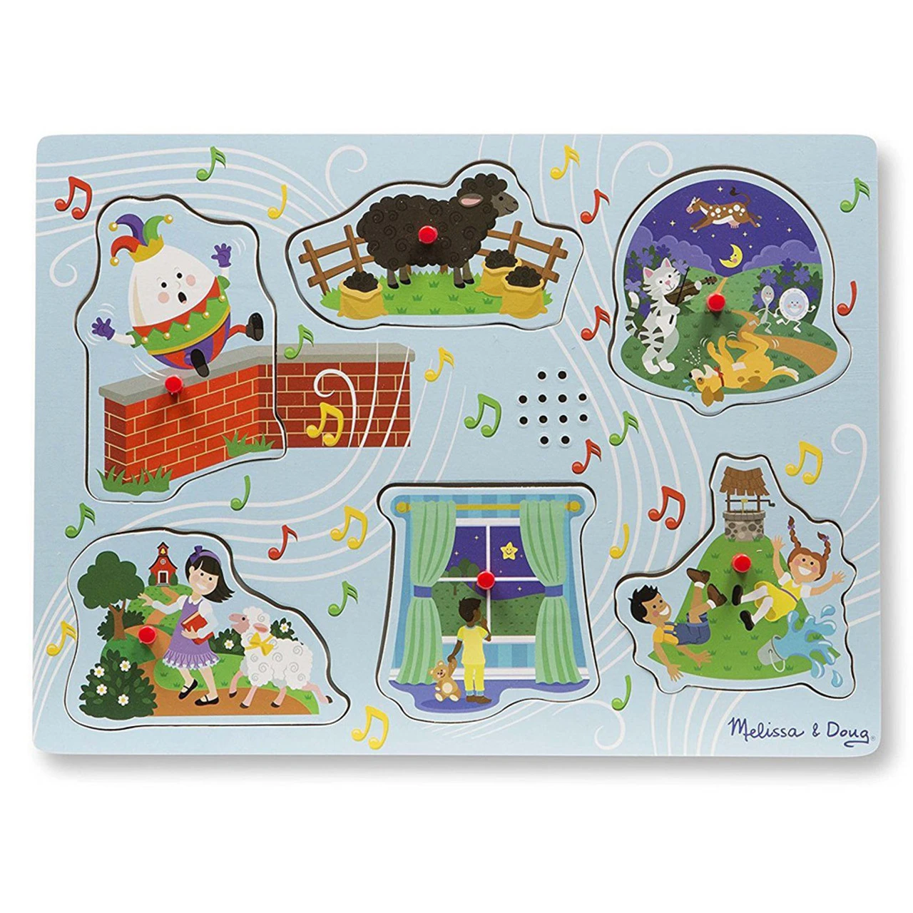 Sing along with favourite childhood characters like Humpty Dumpty and Jack and Jill with this unique wooden peg song puzzle! Match the six illustrated wooden puzzle pieces to the pictures in the beautifully carved wooden puzzle board to hear six different nursery rhymes (Humpty Dumpty, Baa Baa Black Sheep, Hey Diddle Diddle, Mary Had a Little Lamb, Twinkle Twinkle Little Star, and Jack and Jill). Plastic pegs make it easy for small hands to grasp and manipulate the pieces. Lyrics are included on the puzzle so kids can sing along as they complete the puzzle!