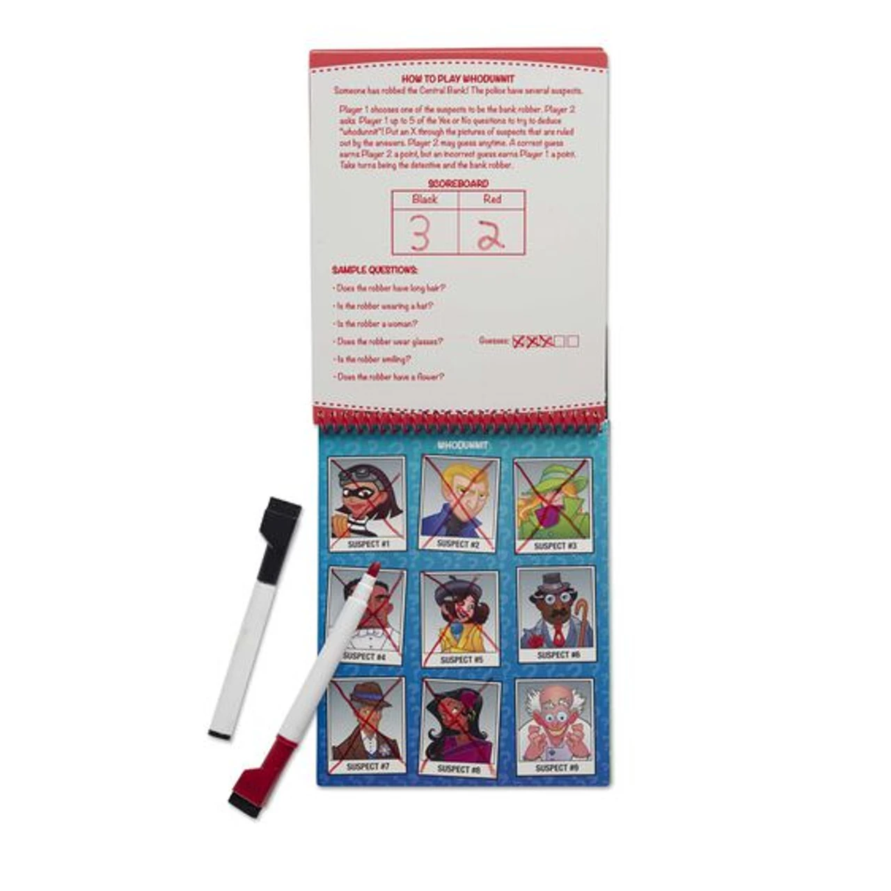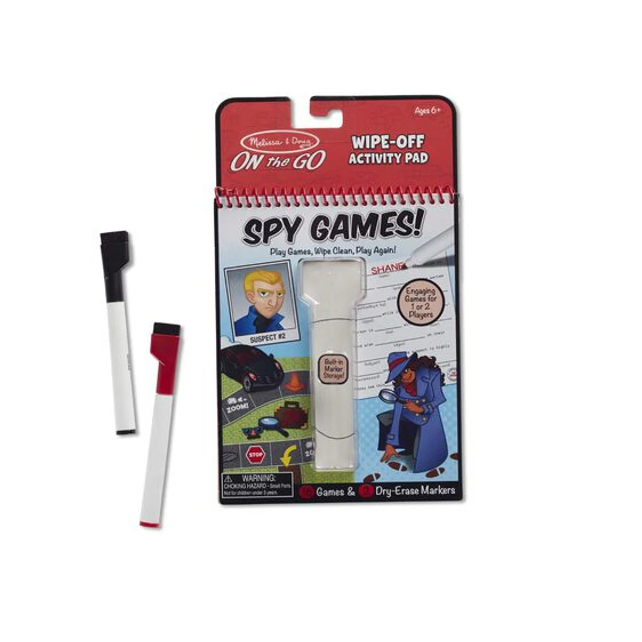 - Activity book of reusable word, picture, and solve-the-mystery spy games for one or two players to do with dry-erase markers
