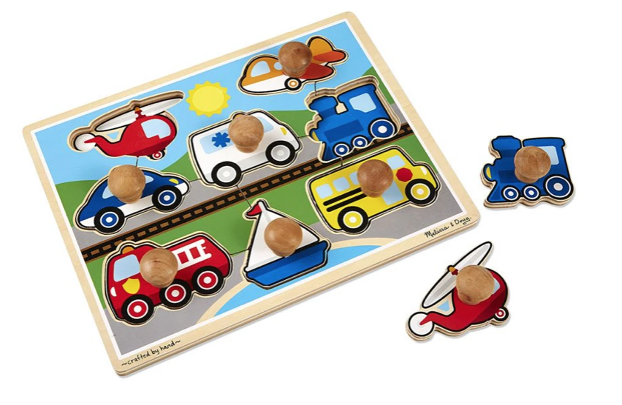 Eight big pieces with oversize knobs make this the perfect first puzzle! The bright, cheerful artwork features a collection of favorite vehicles in the air, land, and sea. Each one has its own illustrated well in the sturdy wooden puzzle board, encouraging young children to match the pictures, maneuver the pieces, and build important fine-motor and cognitive skills through play.