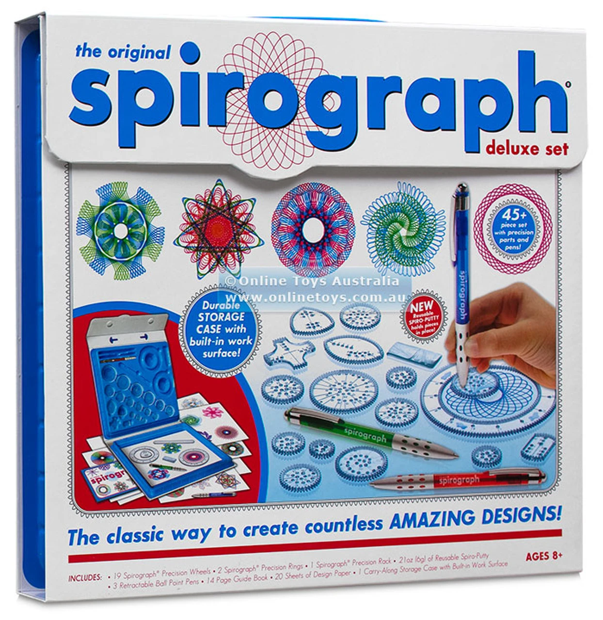The classic way for aspiring artists to create millions of amazing designs is back and better than ever! The Original Spirograph® Deluxe Set features all the iconic wheels and rings of the original, re-engineered and updated for today. The kit features a high quality, durable carrying case with snap-in storage and a built-in drawing surface. The precision engineered Spirograph® gears work with the 3 retractable ballpoint pens included in the set as well as with most standard pens, markers and pencils. The new Spiro-Putty holds the Spirograph® pieces securely on the paper so that you can create intricately beautiful designs with no holes in the paper! The set also comes with 20 sheets of design paper and a full color design guide, which explains the fundamentals of drawing with Spirograph® as well as step-by-step instructions for creating your own designs!