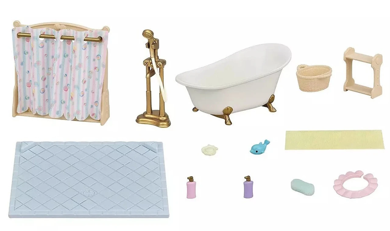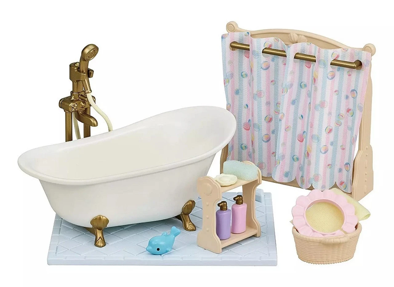 This furniture set features an antique-style bath and shower fitting. It also includes shampoo, soap, bath toy, shampoo hat, and other bath time accessories.