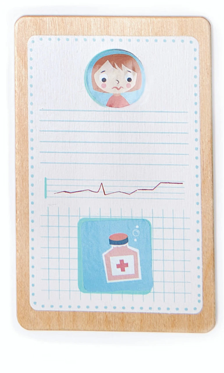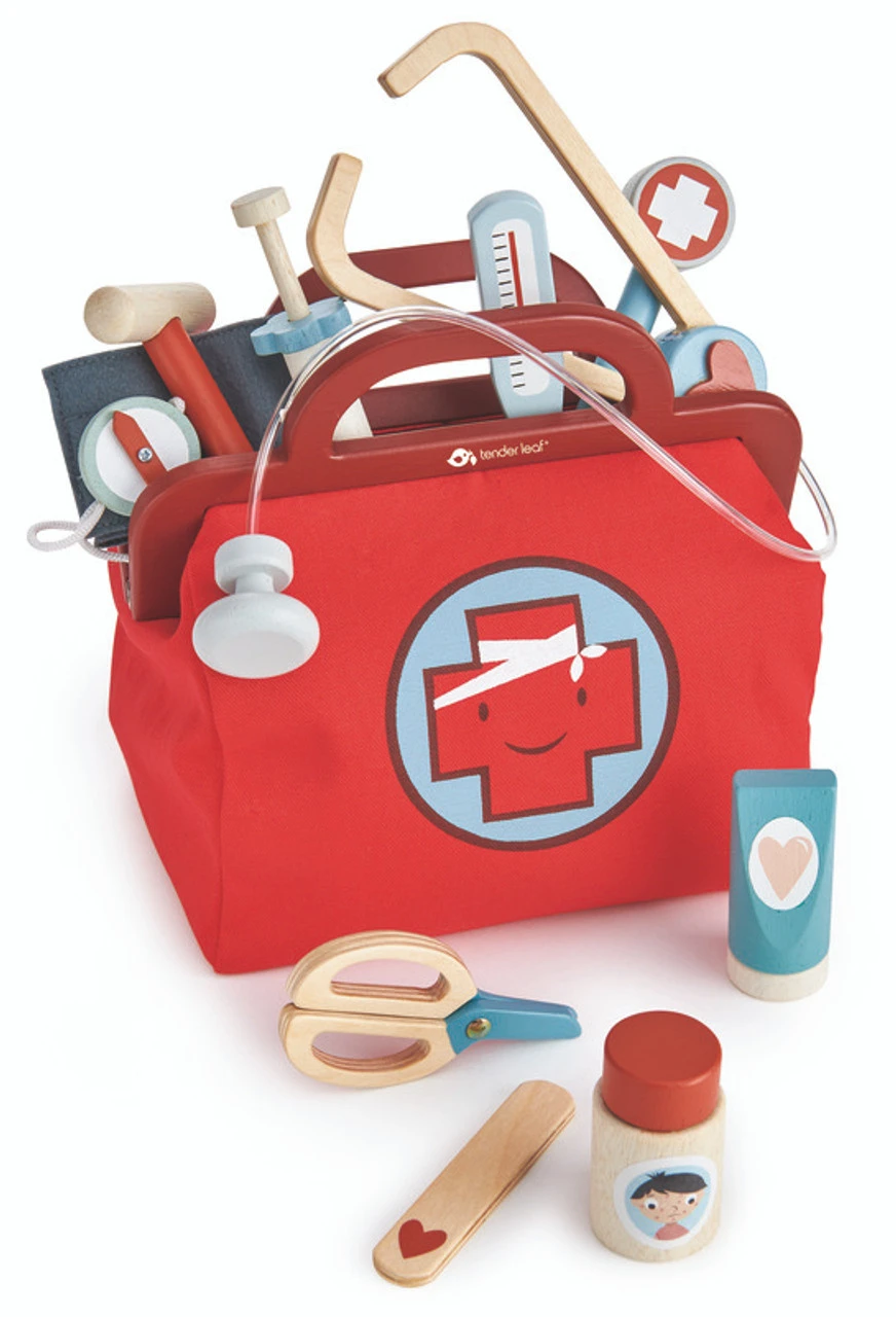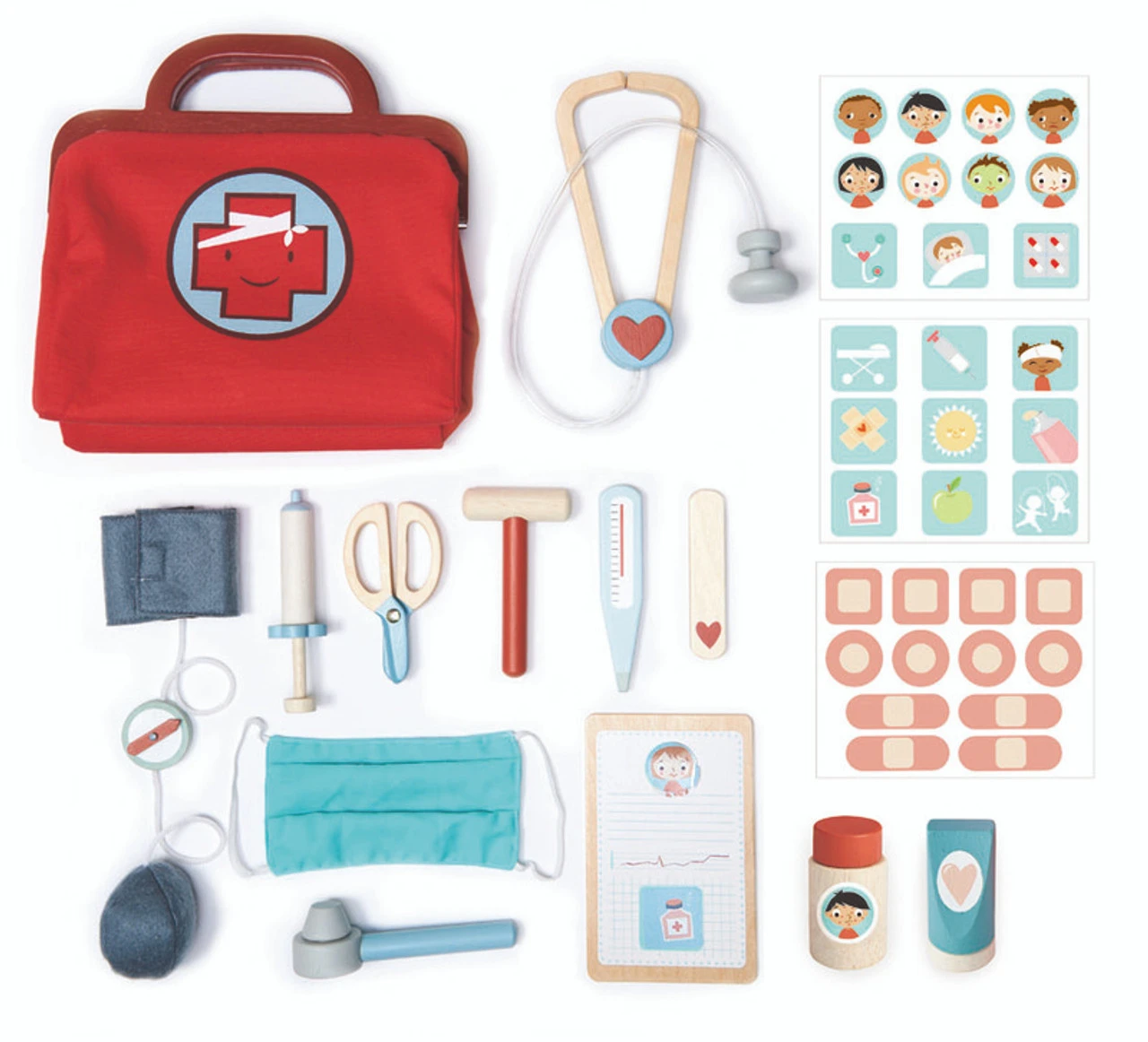 An interactive wooden doctor’s bag filled with wooden medical accessories.