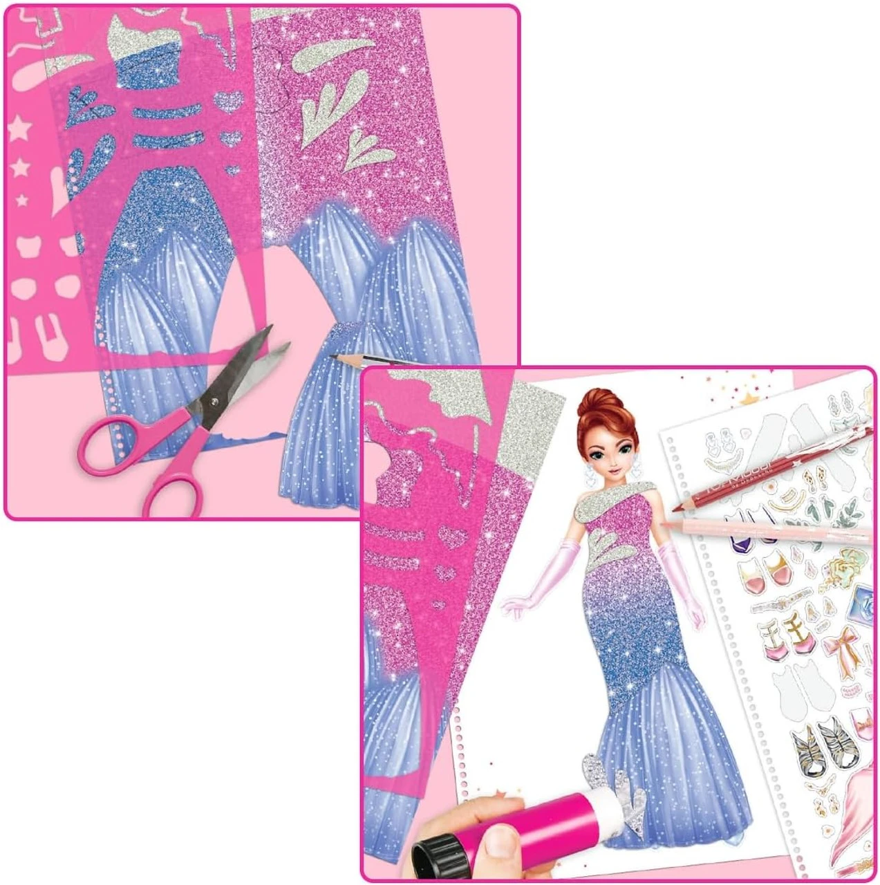 52 pages of glamour: In the spiral-bound creative book “Glamour Special” by TOPModel, you can create classy outfits with 2 sheets full of stickers, 8 sheets of fabric designs (printed on paper) as well as 2 stencils. So handy with a practical carrying handle!